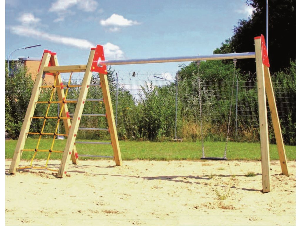 Leagan cu 1 loc si panou de catarare pentru grupa de varste 3-10 ani, cu picioare din lemn cu ø100 mm si bara orizontala cu ø120 mm. Sezut din polietilena rezistent la temperaturi de -85°C si +90°C, rezistent la raze UV.