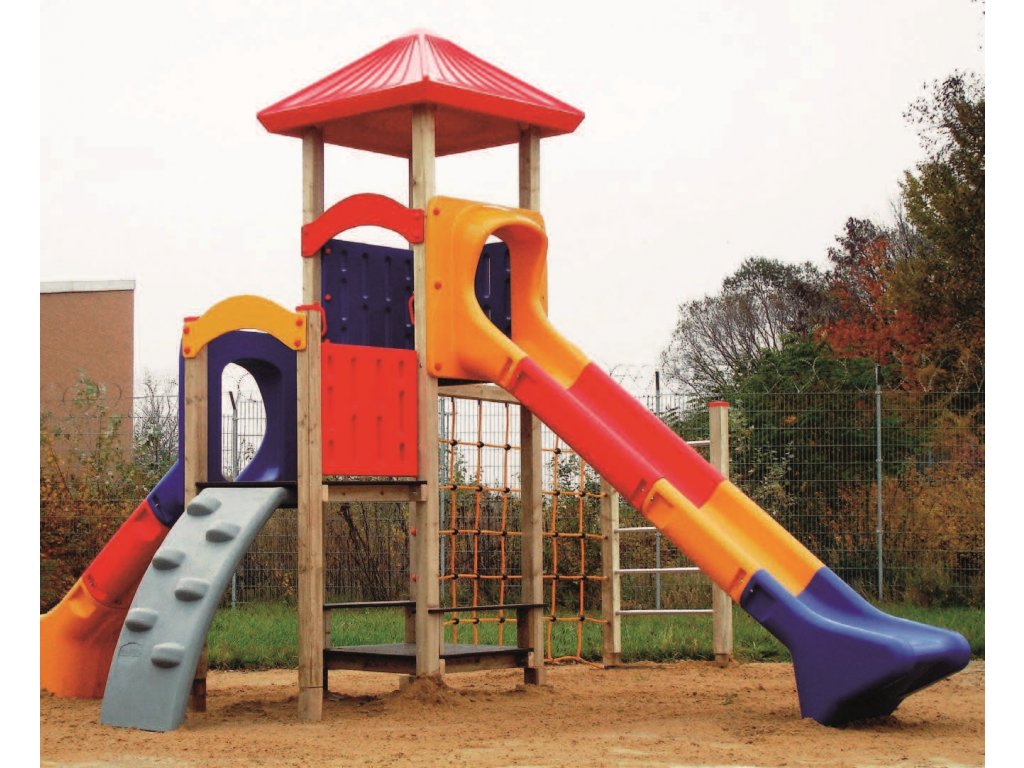 Combinatie de turn cu elemente de catarare si tobogan, potrivita pentru copii de toate varstele.