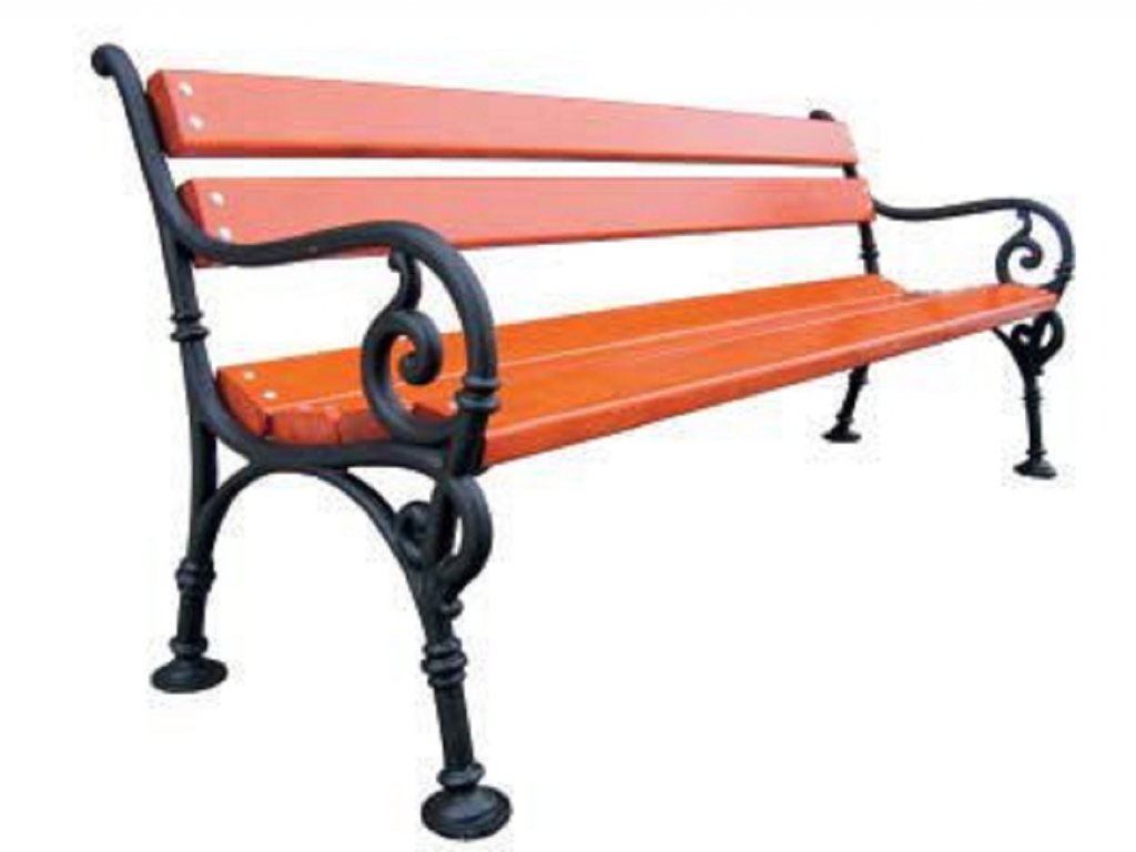 Banca cu schelet din fonta. Suprafata de sedere si spatar din sipci de lemn.