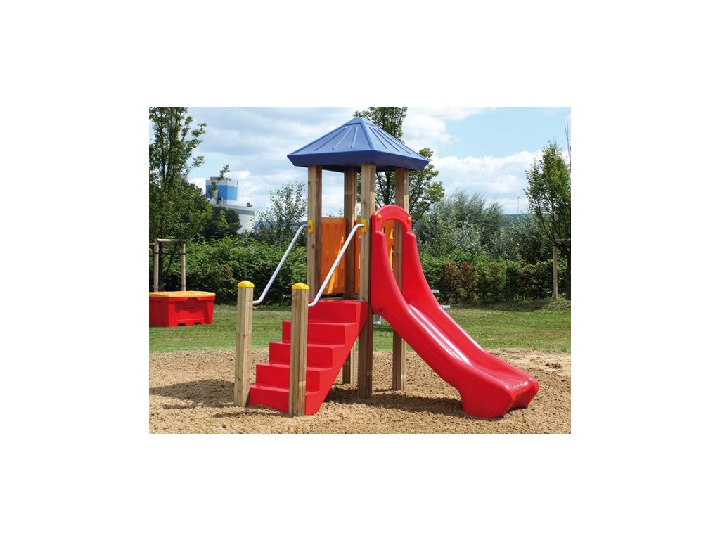 Combinatie de turn cu elemente de catarare si tobogan, potrivita pentru copii mici.
