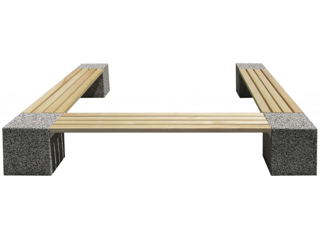 Banca cu picioare din cuburi de beton armat, cu suprafata de sezut din sipci de lemn. Se poate combina si cu elemente cu spatar. Elementele din otel sunt zincate termic. Suruburile de fixare sunt din inox.